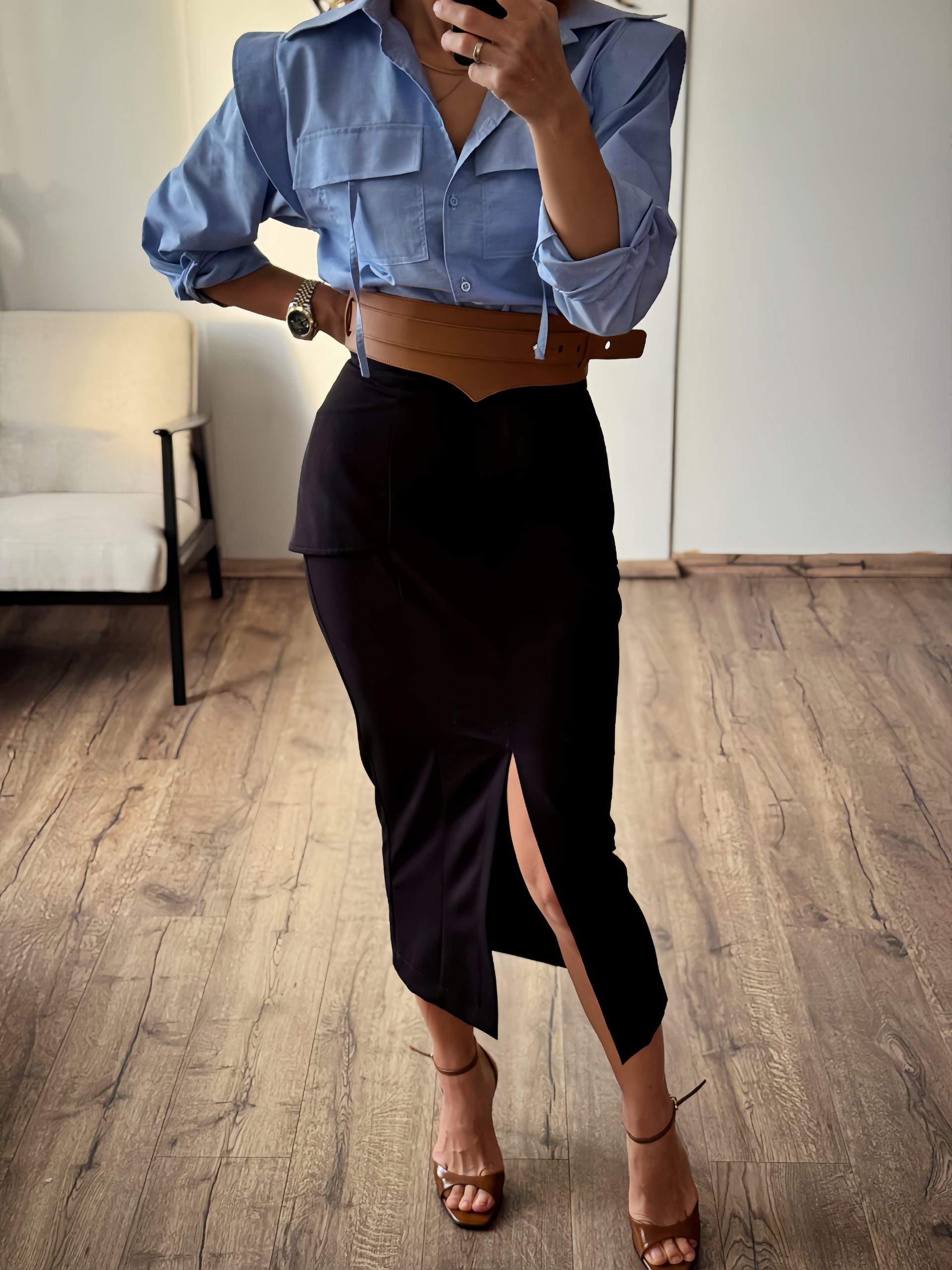 legant midi high-waisted skirt with clean lines and a striking front slit. The soft, comfortable fabric and subtle tailoring details give it a modern, feminine look — perfect for everyday and business outfits.