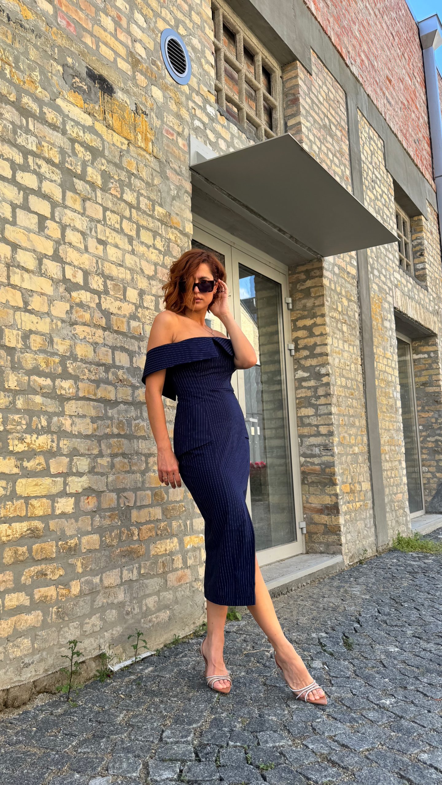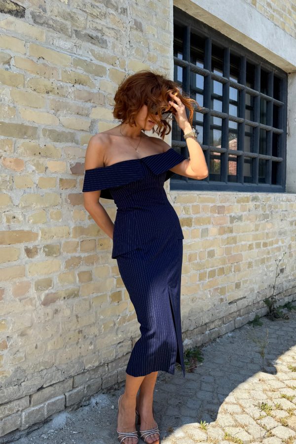 Istaknite svoj stil uz ovu sofisticiranu midi haljinu sa savremenim krojem i bezvremenskom elegancijom. Napravljena od tamnoplave tkanine sa finim belim prugama, ova haljina spaja klasični dizajn sa modernim detaljima.